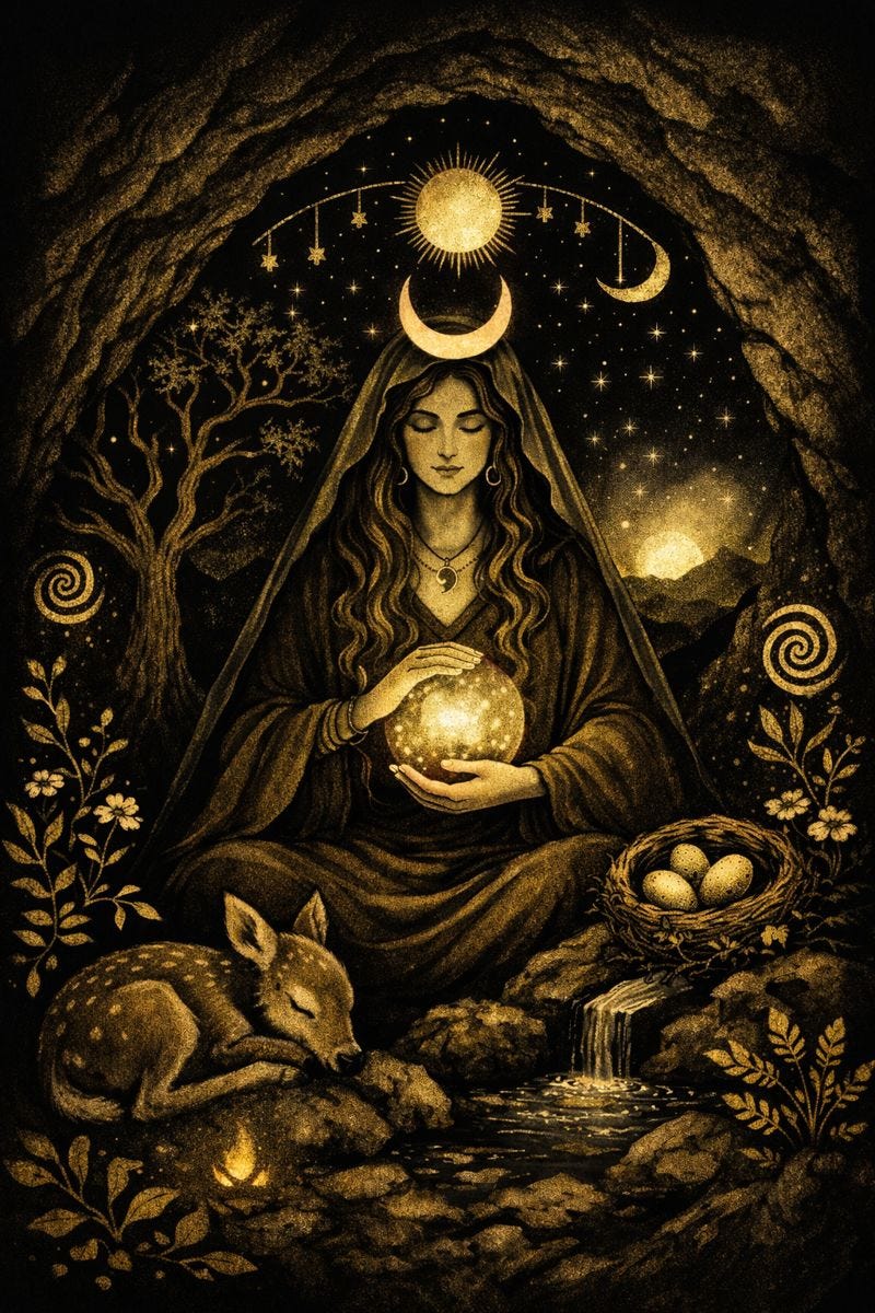 I call in Rhea, ancient Mother of the gods, keeper of wild earth and deep time. She who knew how to hold life while it was still becoming. She who protected what was tender, unfinished, and sacred by hiding it in caves, in mountains, in the body itself. Rhea does not rush emergence. She understands gestation, containment, and the fierce love it takes to let something grow out of sight.